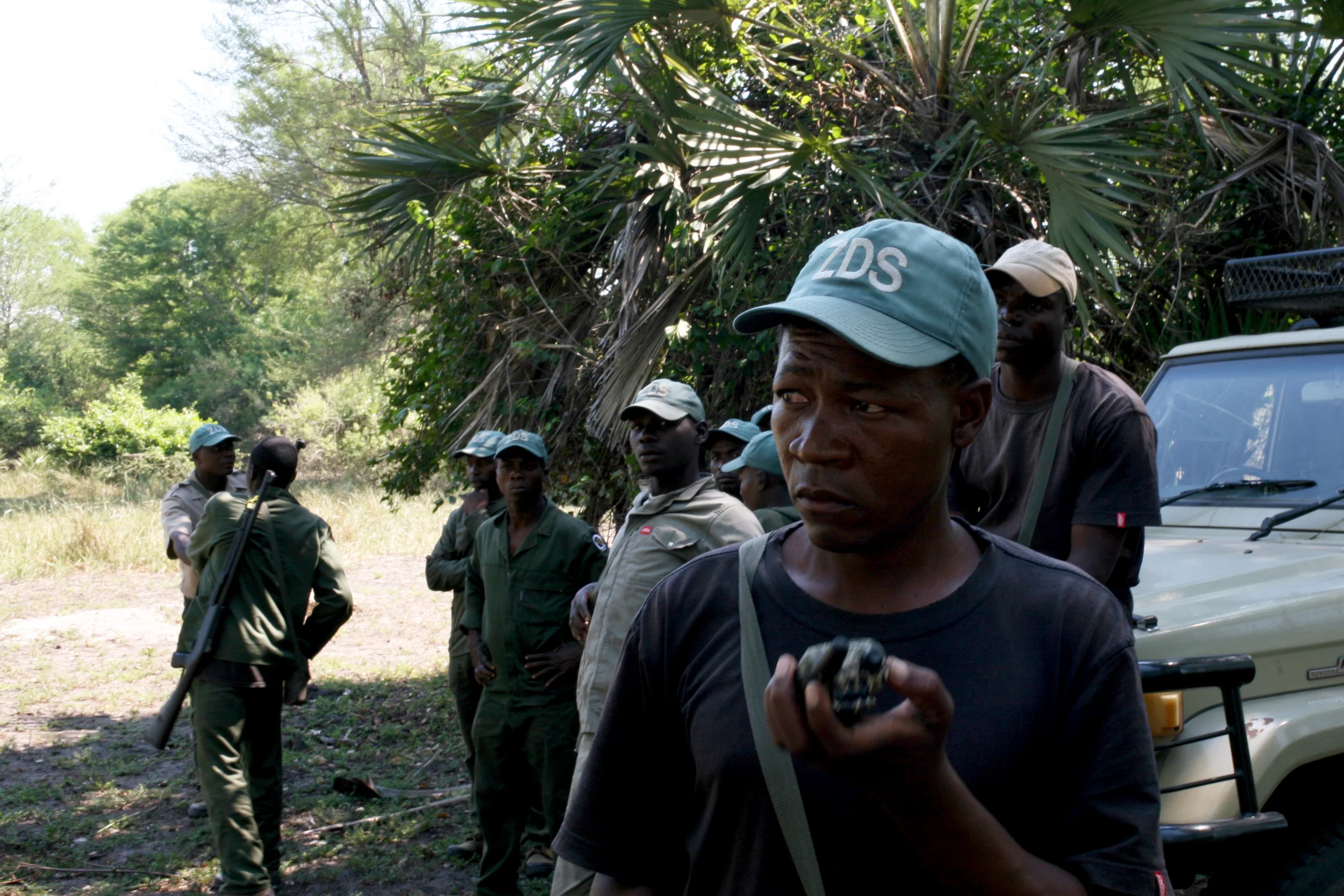 He parks the truck in a patch of sparse, useless shade and issues quick orders, dividing his men into two groups that will come at the poacher’s village from different directions. They bushwhack through the scrubby palm understory to reach a collection of small thatched huts and a lone half-dead tree in the center of a dusty clearing. Scraggly chickens scatter at the uniformed men’s appearance. A handful of women with small children stare at the ground, avoiding eye contact, as the team asks questions that receive monosyllabic responses. Then a ranger yells sharply from a thicket of palms.